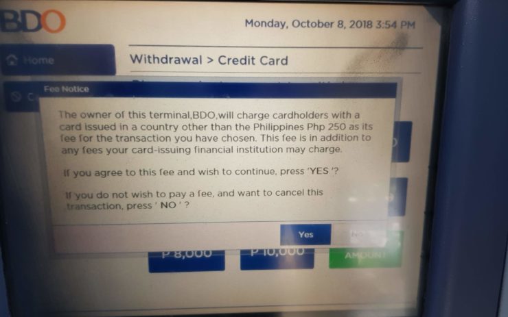 すると、注意書きのような画面が表示されますが、こちらの内容は「一回の引き出し手数料が250ペソ(約500円)かかりますがいいですか?」と聞かれているので、Yesをタップします。